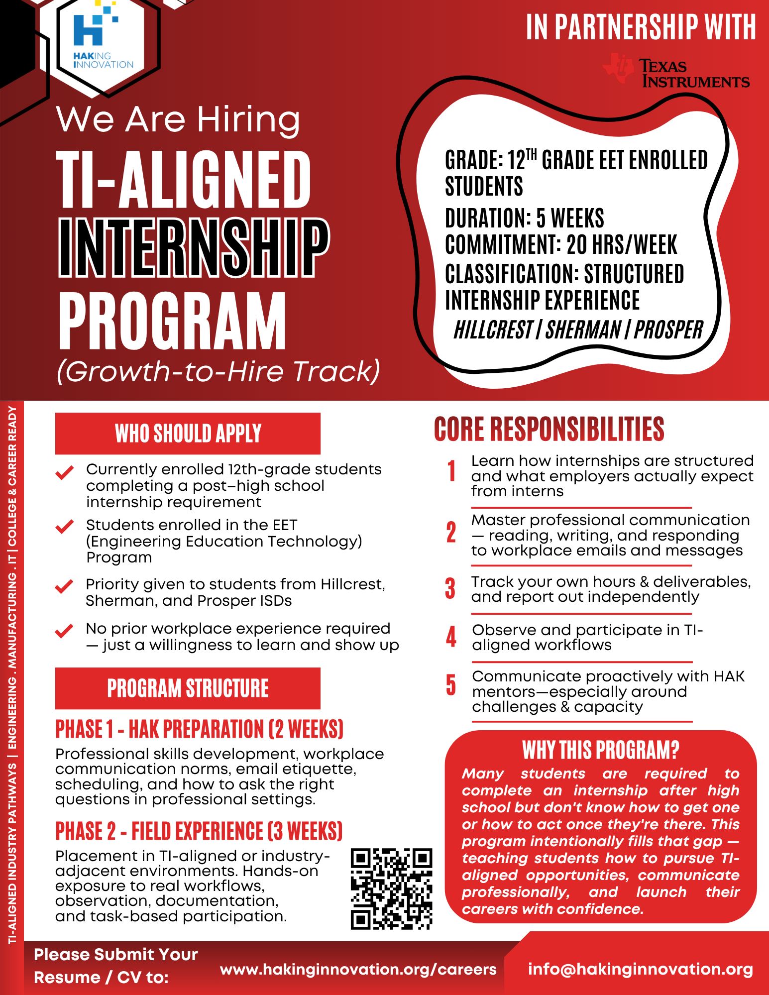 "Many students are required to complete an internship after high school but don't know how to get one—or how to act once they’re there. This program intentionally fills that gap. We teach you how to pursue TI-aligned opportunities, communicate professionally, and launch your career with confidence."