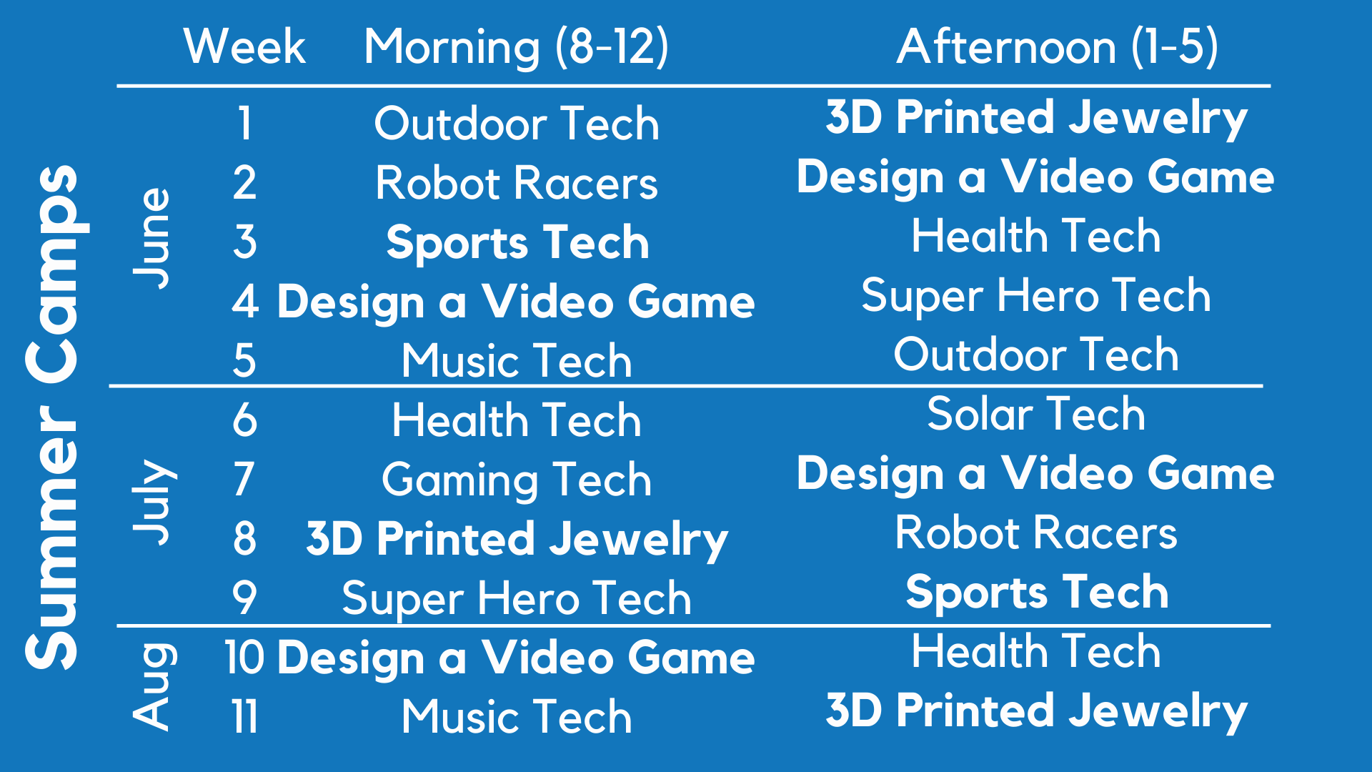 Every week has an AM (8am - 12pm) and PM (1pm - 5pm) camp.